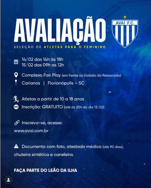 As inscrições podem ser realizadas gratuitamente até às 20h do dia 13 de fevereiro. Para fazer a inscrição, basta preencher o formulário através do site avai.com.br ou pelo link nos destaques “🦁📝 | Seletiva”.