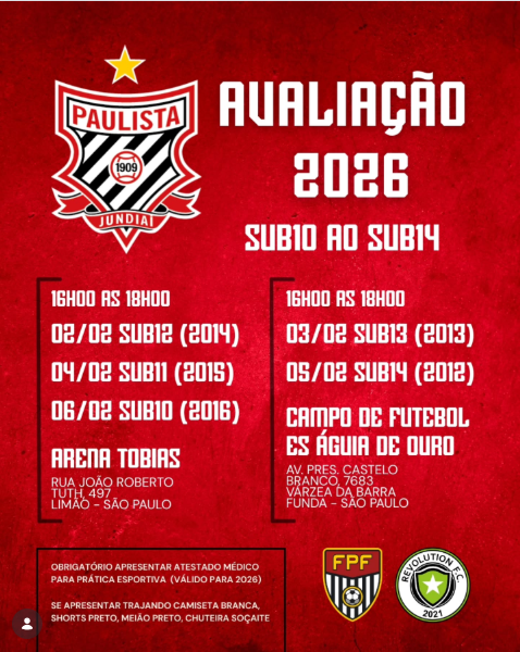 Avaliação para atletas de 10 a 14 anos, em parceria com o Revolution FC, com a chance de disputar o Campeonato Paulista e demais competições vestindo a camisa do Paulista de Jundiaí 🔴⚪